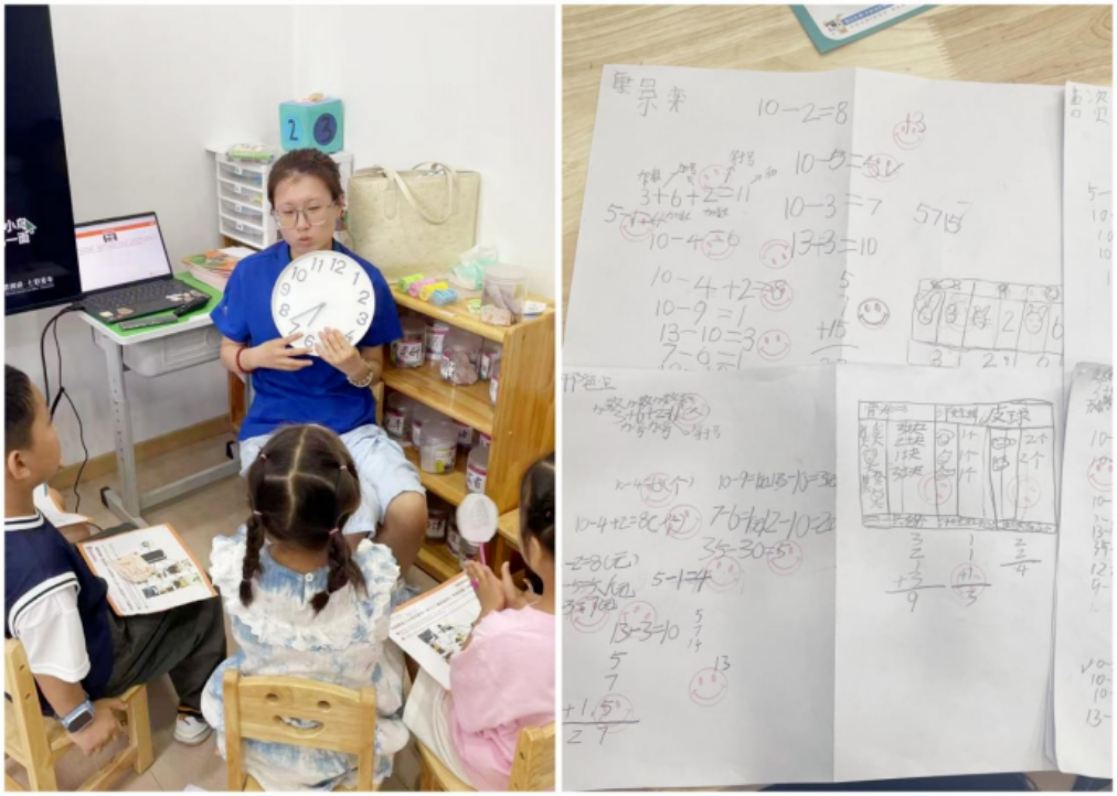 看钟说时:老师拨动钟表,孩子快速说出时间。反复练习中,孩子自然理解指针与时间的关联。
