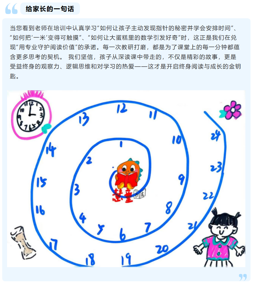 本周培训中,栗子老师讲解了深度阅读课程《时钟王国》中认识时钟“时钟互动三步法”,通过趣味引导和反复练习,帮助孩子轻松掌握时针、分针和秒针的特点。
