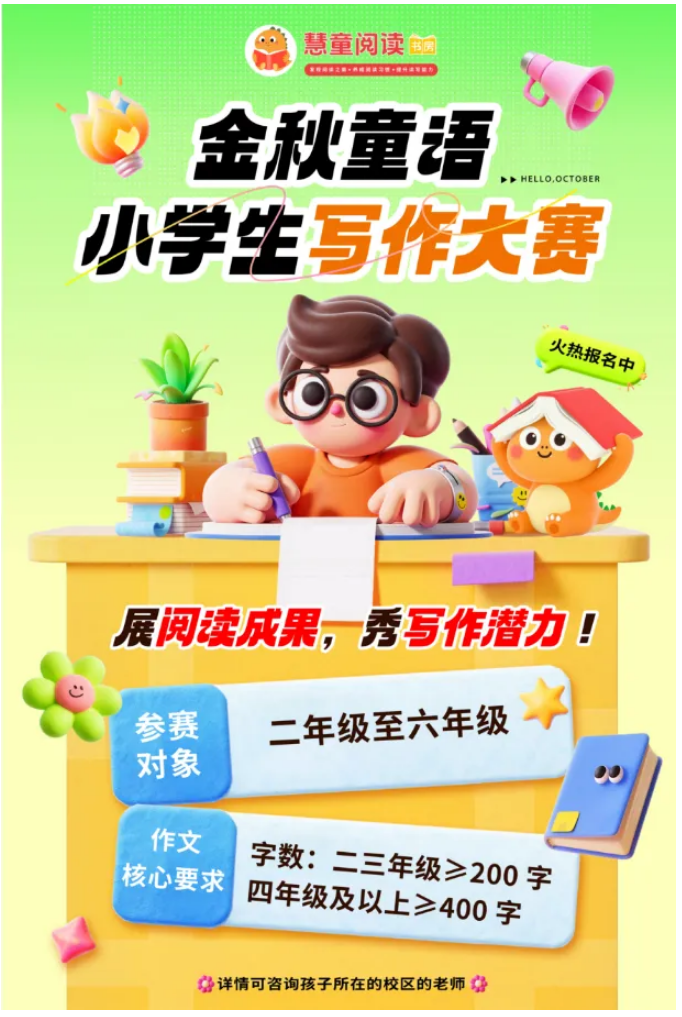 作为陪伴孩子阅读成长的重要伙伴,各地区阅读馆始终在为孩子搭建优质的阅读平台。此次慧童阅读书房面向慧童阅读加盟馆将于 10 月份进行金秋童语,小学生作文大赛,为孩子打造展示阅读成果、释放写作潜力的舞台,具体事宜通知如下: