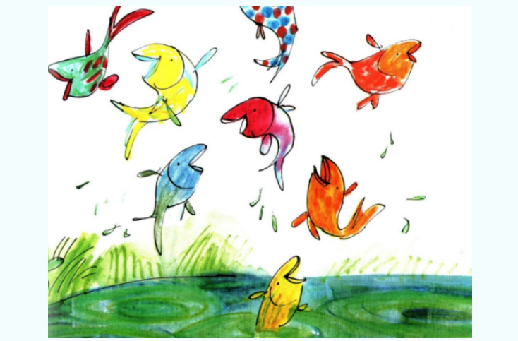 没想到孩子们的答案瞬间 “炸开了锅”,满是童真与创意:“这条蓝点点的鱼,像裹了星星糖的棉花!”(生动比喻)“红鱼的尾巴甩得比秋千还高!”(大胆夸张)“绿鱼在跟音符跳圆圈舞!”(鲜活拟人)